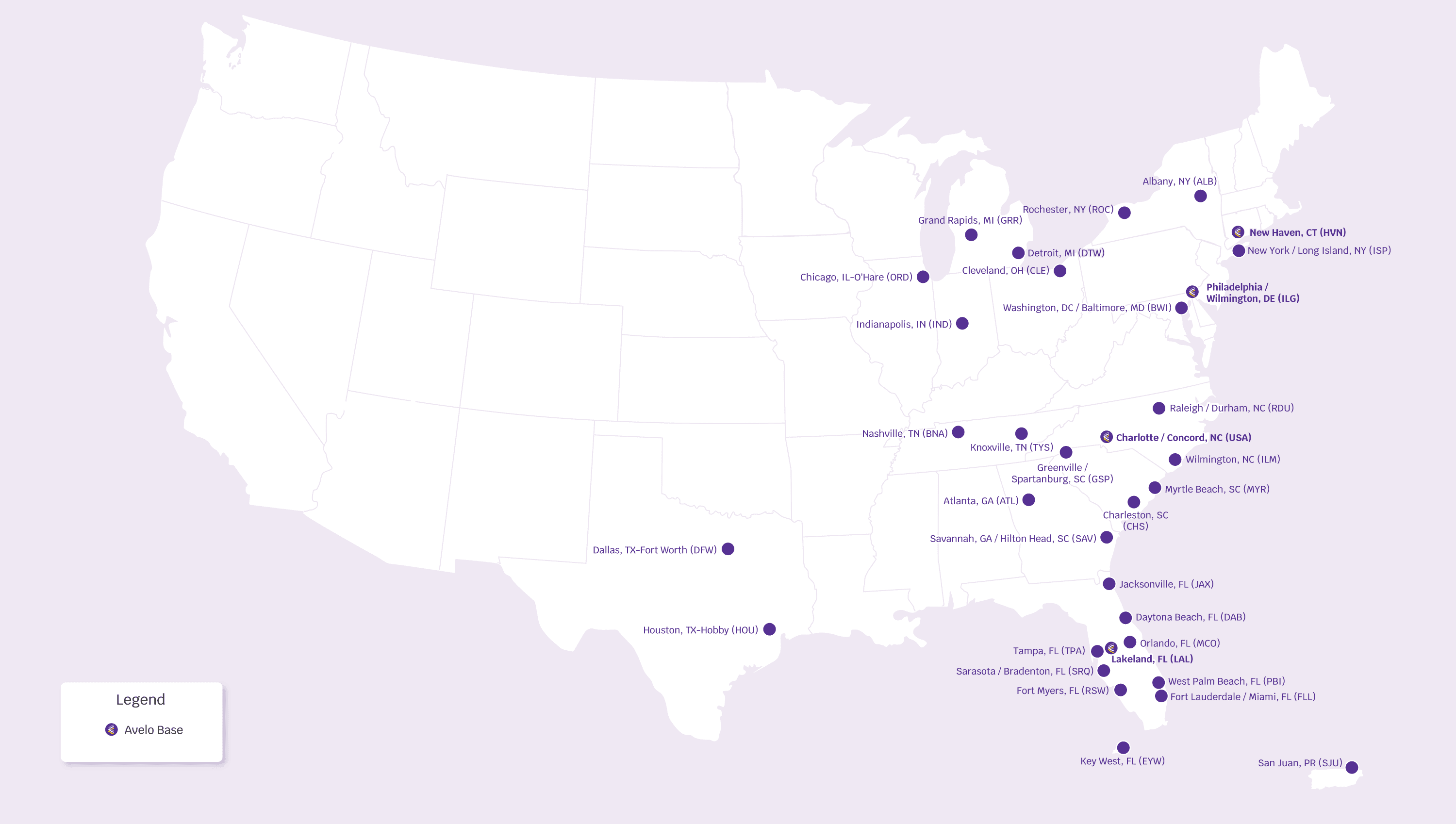 Avelo Route Map Click on a dot below to zoom in and explore our routes.close